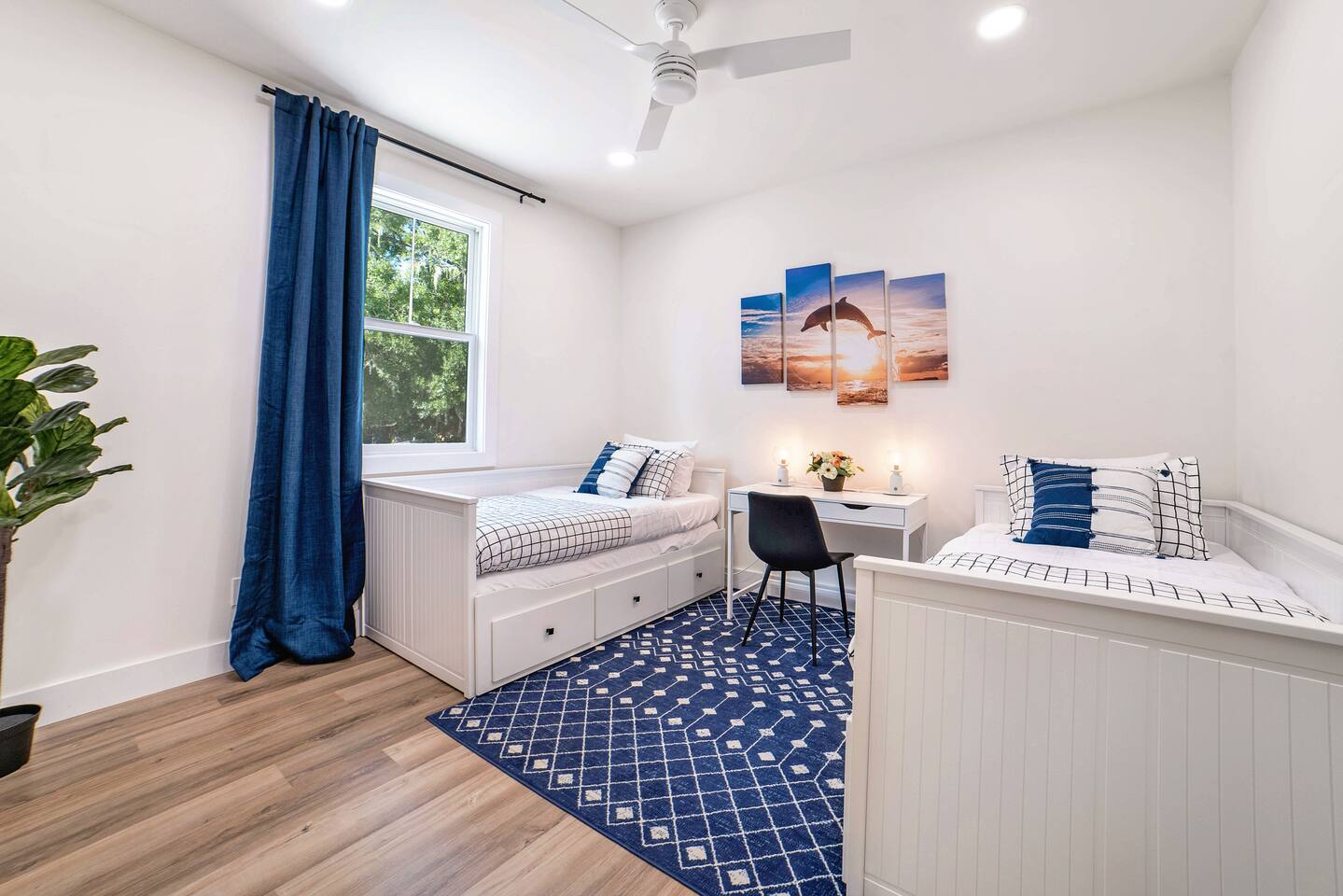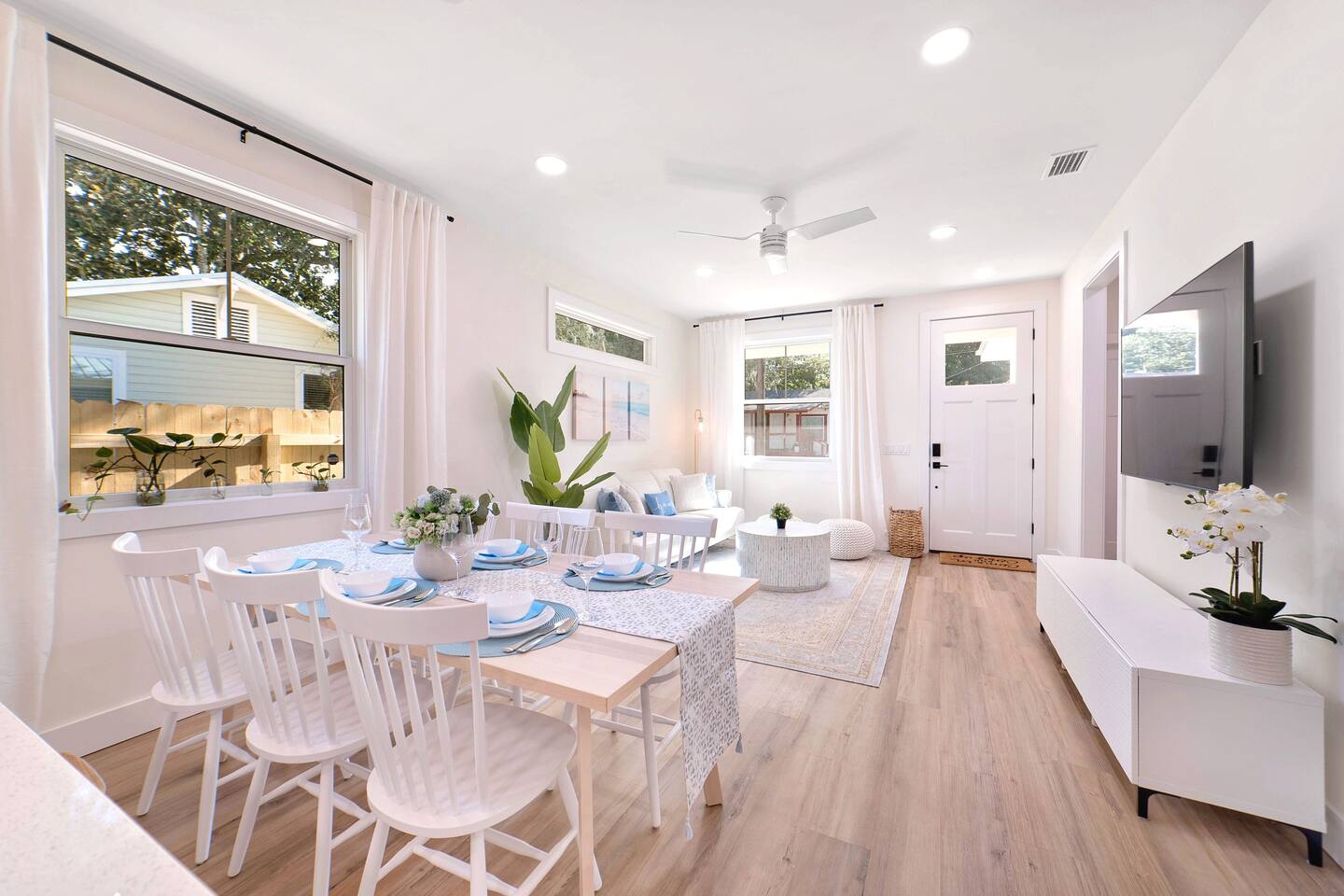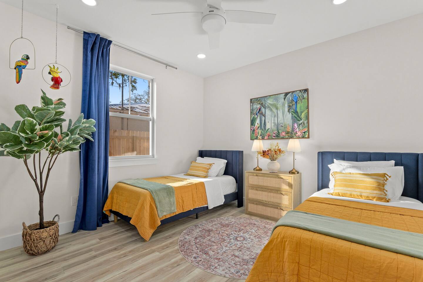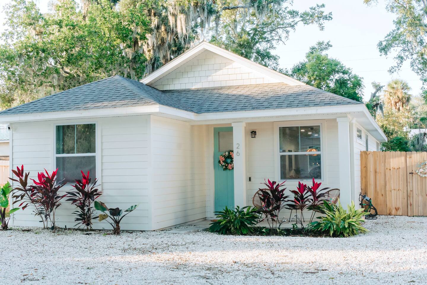 ✦ Why our guests love these homes ✦ Each House Has: • Primary King Suite: Your private retreat with a king bed, en-suite bathroom, walk-in closet, smart TV, and direct access to the backyard patio. • Queen Bedroom: Cozy and functional, featuring a queen bed, workspace, smart TV, and shared bathroom. • Twin Room: Perfect for kids or extra guests, this room features twin beds, plus a smart TV. **One house features twin trundle beds that will pull out to a king bed** • Living Room: A cozy space with a leather couch, high ceilings, and a 65” smart TV for movie nights or streaming your favorites. • Fully Stocked Kitchen: Cook with ease in the modern kitchen, complete with all cookware and a coffee station. • Dining Space: Room for everyone with seating for 6 at the dining table and 4 at the kitchen bar. • Outdoor Bliss: Unwind in the private, fenced backyard with a hammock, swing, and covered patio seating area with a ceiling fan. • Beach Essentials: Chairs, umbrellas, a cooler, and more are provided for your beach adventures. • Extra Amenities: High-speed WiFi, in-home washer/dryer, and professional cleaning before each stay. Check-in is seamless with our keyless smart lock. Your personalized code will be shared prior to arrival for hassle-free entry. Our homes are centrally located, offering easy access to St. Augustine’s historic attractions, family-friendly activities, and gorgeous beaches. Approximate Travel Times: ➤ Historic Downtown (St. George Street) - 5 Minutes ➤ Castillo de San Marcos - 7 Minutes ➤ St. Augustine Beach - 12 Minutes ➤ Anastasia State Park - 10 Minutes ➤ Lightner Museum - 6 Minutes ➤ Alligator Farm Zoological Park - 10 Minutes ➤ Flagler College - 5 Minutes ➤ Vilano Beach - 15 Minutes Whether you’re exploring history, soaking up the sun, or enjoying local dining, you’ll find everything just minutes away from this prime location with: 🏖️ Beach-Ready Perks: Includes chairs, umbrellas, and coolers for your beach days. 🌴 Relaxation Awaits: Private backyard with hammock, swing, and covered patio seating. ⭐ Modern Comfort: Bright, white decor with spacious living areas and top-tier amenities. 📍 Prime Location: Close to St. Augustine’s historic downtown and beaches. Please Note: Florida’s wildlife is part of its charm, but we do share our space with some uninvited guests, including lizards, mosquitoes, and occasional spiders, as well as other residents of Florida’s diverse ecosystem. While we have regular pest control, keeping doors and windows closed when not in use will help minimize their visits. 🦎